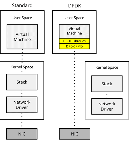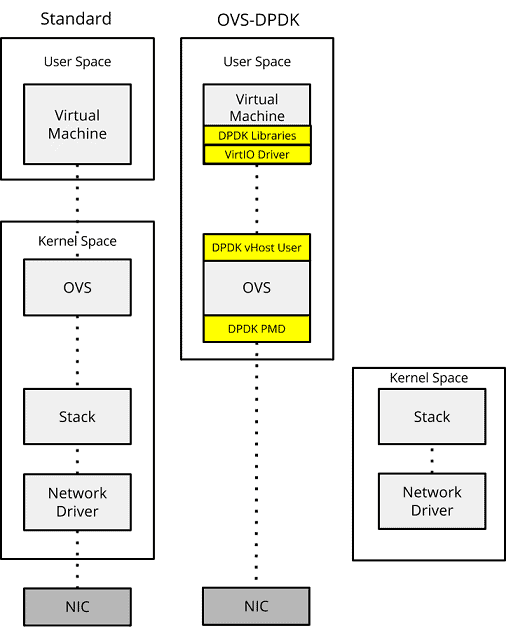 OVS-DPDK moves the OVS kernel data path into userspace. Frames are then retrieved directly from the NIC using a poll mode driver (PMD), allowing us to bypass the kernel.