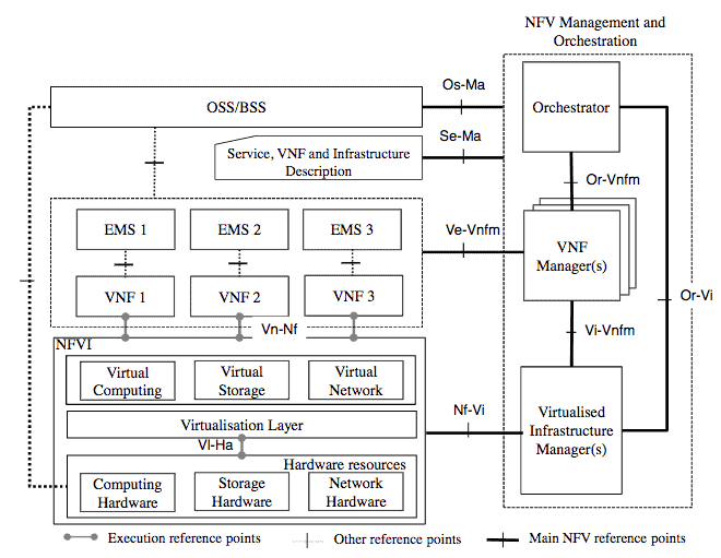 The ETSI NFV ISG Architectural Framework (ETSI GS NFV 002) standardizes NFV by defining the various elements required in virtualizing networking functions. This framework contains two main sections – the High-Level NFV Framework and the Reference Architectural Framework.