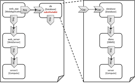 Finally, TOSCA supports a feature called substitution mapping. This basically allows you to take an entire Service Template and reuse it within another. For instance, Figure 5 shows an example via the reuse of the database.