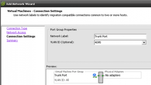 In order to create a trunk port in ESX you need to : Within vSphere or ViClient go to the “Configuration” tab. Select “Networking“ Select your “Add Networking“. Choose “Virtual Machine” and click “Next“ Select your Virtual Switch (or create one), then click “Next“ Choose you Network label and then add the VLAN ID as … Read more